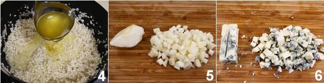 depois, gradualmente, à medida que o arroz seca, adicione uma concha de caldo de cada vez 4, até a completa cocção (cerca de 15 minutos). Enquanto isso, descasque as peras, retire suas sementes internas e corte-as em cubos 5. Bata uma das peras com um mixer. Retire a casca do gorgonzola picante e corte-o em cubos 6.