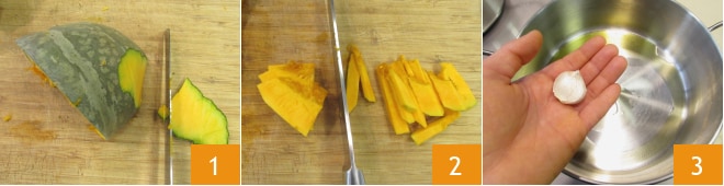 Para preparar o risoto de abóbora e speck, primeiro prepare o Caldo de legumes e mantenha-o quente. Limpe a abóbora removendo as sementes internas e a casca com uma faca 1, depois corte-a grosseiramente em pedaços 2. Em uma panela, aqueça um fio de azeite junto com um dente de alho com casca 3.