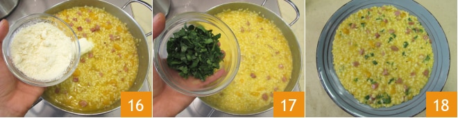 Adicione também o Grana Padano DOP ralado 16 e misture bem. Finalize com a salsinha picada 17. Seu risoto de abóbora e speck está pronto para ser servido bem quente 18!