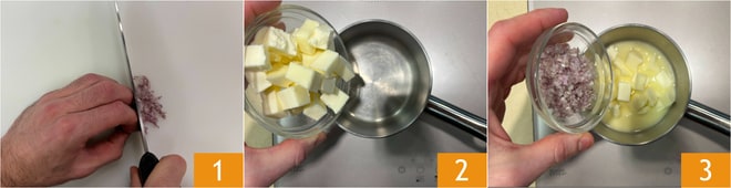 Para preparar o risoto de maçã e zola, comece se dedicando à manteiga ácida. Pique finamente a chalota 1. Em uma panela pequena, derreta a manteiga 2 e adicione a chalota 3.