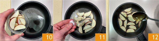 Em uma frigideira, derreta a manteiga, adicione as fatias de maçã 10 e tempere com sal 11 e pimenta. Salteie em fogo médio por 3 minutos. Adicione o mel 12.