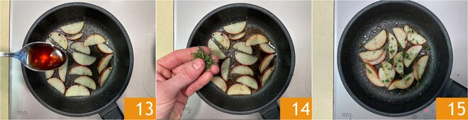 Regue com vinagre de vinho tinto 13. Adicione o tomilho 14 e desligue o fogo. Reserve, pois será utilizado na montagem do prato 15.