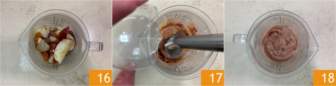 Retome as maçãs assadas no forno e transfira para um copo 16. Bata com o mixer de imersão, se necessário adicione um pouco de água 17, cerca de 20 g, até obter um purê homogêneo 18.