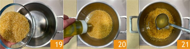 Coloque o arroz em uma panela 19, adicione o óleo 20 e toste por alguns minutos. Regue com caldo de legumes 21 e cozinhe adicionando uma concha de caldo toda vez que o anterior for absorvido pelo arroz.