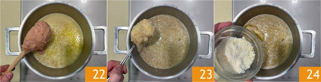 Um minuto antes do fim do tempo de cozimento, adicione o purê de maçãs 22, a manteiga ácida 23 e o parmesão 24. Desligue o fogo e misture.
