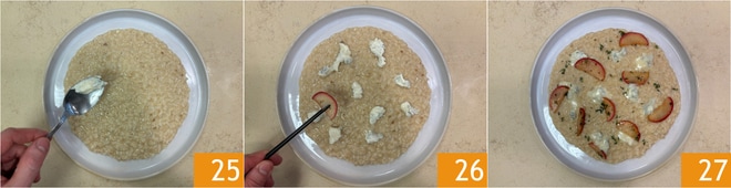 Deixe o risoto descansar por 1 minuto, depois sirva e adicione pedaços de gorgonzola 25. Coloque sobre o arroz as maçãs salteadas na frigideira 26 e finalize com uma pitada de tomilho. O seu risoto de maçã e zola está pronto para ser servido 27.