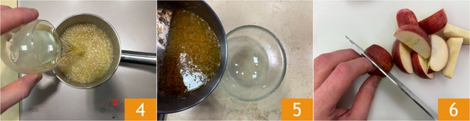Assim que a chalota começar a dourar, regue com vinho branco 4 e cozinhe por 5 minutos em fogo médio. Uma vez pronto, transfira para uma tigela 5 e deixe solidificar na geladeira enquanto continua com a receita. Enquanto isso, prepare o purê: corte 2 maçãs em fatias 6, retire as sementes e a parte central.