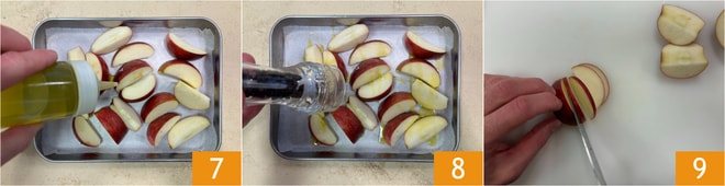 Transfira para uma assadeira coberta com papel manteiga e tempere com óleo 7, sal e pimenta 8. Asse em forno ventilado, pré-aquecido a 200°C por 15 minutos. À parte, corte uma maçã em fatias de 2 mm de espessura 9.