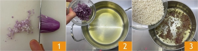 Para realizar o risoto do Rei, primeiro coloque os pistilos de açafrão em uma tigela, cubra com água fria e deixe de molho por 2 horas. Enquanto isso, prepare o caldo de frango e mantenha-o quente. Pique finamente a cebola roxa 1 e refogue em uma panela grande com um bom fio de óleo 2, depois adicione o arroz 3.