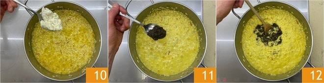Após alguns minutos, adicione o gorgonzola 10 e mexa para dissolvê-lo completamente. Adicione também o creme de trufa 11 e misture bem 12. Continue a cozinhar o arroz por mais 3-4 minutos.