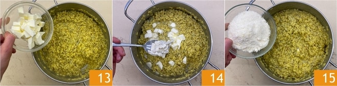 Quando o risoto estiver pronto, retire-o do fogo e misture com a manteiga em cubos fria do congelador 14, gorgonzola em cubos 14 e Grana Padano DOP ralado 15.