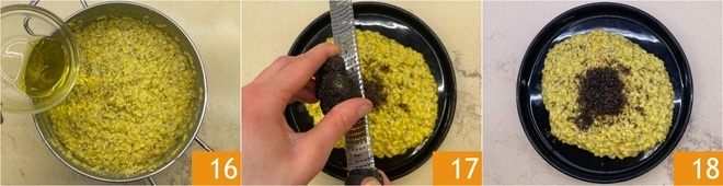 Adicione também um fio de óleo 16 e mexa bem. Por último, rale a trufa negra diretamente no prato 17. O seu risoto do Rei está pronto para ser servido 18!