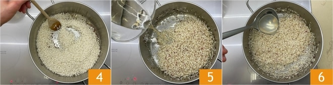 Toaste o arroz por alguns minutos, mexendo continuamente 4. Quando os grãos estiverem quentes ao toque, adicione o vinho branco 5 e deixe evaporar completamente a parte alcoólica. Neste ponto, comece a adicionar o caldo de frango, uma concha por vez, sempre esperando que o anterior seja absorvido 6.