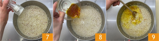 Salgue 7 e continue cozinhando por cerca de 3 minutos, depois adicione o açafrão 8 e mexa bem 9.