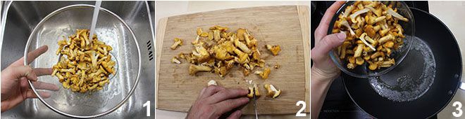 Para preparar o risoto amarelo com chanterelles, lave os cogumelos em água corrente 1, seque-os com um pano de prato e divida ao meio os maiores 2. Refogue os chanterelles em uma frigideira com 40g de manteiga 3 por alguns minutos e adicione sal levemente.