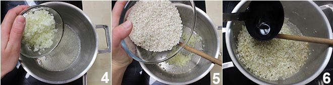 Em uma panela grande, derreta os 40g de manteiga restantes e doure a cebola picada finamente 4. Adicione o arroz e deixe-o tostar por alguns minutos, mexendo para não grudar 5. Durante o cozimento, adicione o caldo ao arroz, acrescentando uma concha de cada vez 6.