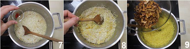 Após 10 minutos, adicione o açafrão 7 e continue o cozimento adicionando mais caldo e mexendo 8. Quase no final do cozimento, adicione os cogumelos cozidos 9 e ajuste o sal, se necessário. Finalize com uma pitada de pimenta e, com o fogo desligado, adicione o queijo grana e misture. Sirva o risoto amarelo com chanterelles quente.