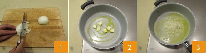 Para preparar o risoto pannerone e peras, comece preparando o Caldo de legumes. Uma vez pronto, pique finamente a cebola 1, coloque a manteiga e o azeite em uma panela 2, aqueça e adicione a cebola 3.