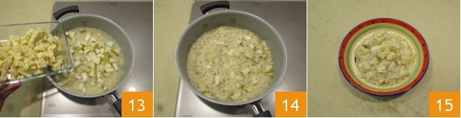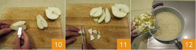 Lave as peras, divida em 4 partes e retire o miolo central com uma faca pequena, sem remover a casca 10, depois corte cada pedaço em cubos 11. Quando o arroz estiver quase cozido, adicione os cubos de pera 12