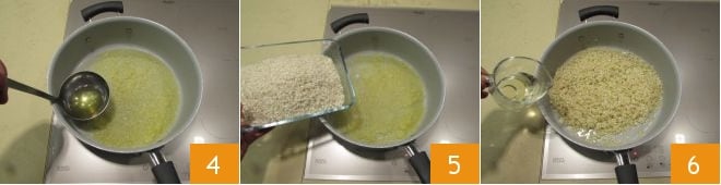 Adicione uma concha de caldo quente 4 e deixe refogar; depois adicione o arroz 5 e toste mexendo frequentemente. Só quando ele mudar de cor você poderá regar com o vinho branco 6.