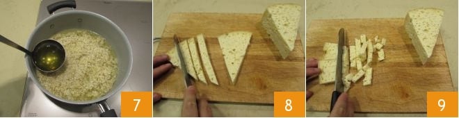 Continue o cozimento do arroz adicionando uma concha de caldo de vez em quando 7 e mexendo com frequência. Enquanto isso, corte o pannerone: primeiro em tiras 8 e depois em cubos 9.