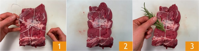 Para preparar o roast beef na fritadeira a ar, primeiro dedique-se à Como amarrar o assado como se fosse um assado 1 2. Insira um ramo de alecrim sob o barbante 3.
