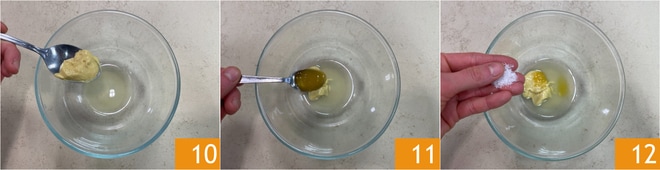 Enquanto isso, dedique-se à preparação do molho. Em uma tigela, coloque o suco de limão, a mostarda 10, o mel 11, o sal 12 e misture para incorporar os ingredientes.