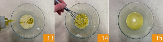 Adicione o óleo em fio 13 e misture 14 até obter um molho liso e homogêneo 15.