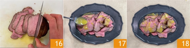 Corte o roast beef em fatias 16, emprate e regue com o creme de mostarda e mel 17. Seu roast beef na fritadeira a ar está pronto para ser servido 18!