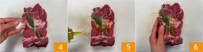 Tempere com sal 4 e óleo 5, depois massageie a carne 6 para distribuir o tempero uniformemente por toda a superfície.