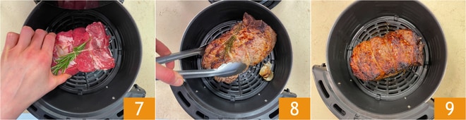 Coloque a carne no cesto da fritadeira a ar (usamos uma fritadeira com capacidade de 6 litros) 7 e cozinhe a 200° por 10 minutos, virando na metade do cozimento 8. Neste ponto, ajuste a temperatura para 180° e continue o cozimento por mais 20-30 minutos 9, virando a carne frequentemente para não queimar. A carne estará cozida quando atingir a temperatura interna de 48-50°C. Deixe amornar.