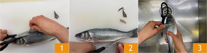 Para preparar o robalo na Airfryer comece pela Como limpar o robalo (spigola). Corte as nadadeiras laterais 1 e as nadadeiras dorsais 2, faça um corte na barriga, eviscere-o e remova as escamas sob água corrente 3.