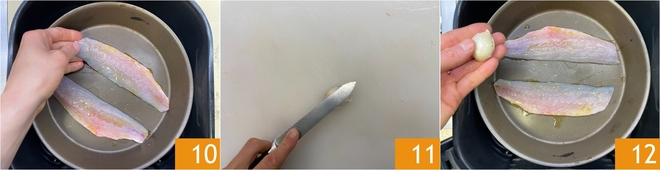 Arrume uma assadeira adequada para a Airfryer (capacidade de 6 L) e coloque 2 filés temperados por vez, ou mais, conforme a capacidade do seu cesto 10. Amasse um dente de alho 11 e adicione na assadeira 12.