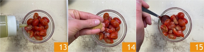 Corte os tomatinhos datterino e tempere-os em uma tigela com azeite extravirgem 13, sal e açúcar mascavo (muscovado) 14. Misture para incorporar bem os ingredientes 15.