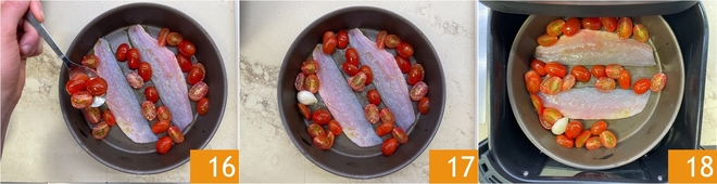Adicione 1/4 dos tomates na assadeira 16, tentando não sobrepô-los aos filés 17. Agora ajuste a temperatura da Airfryer para 170 graus e insira o cesto 18.