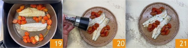 Cozinhe por 7 minutos 19, ou até que o robalo esteja cozido e os tomatinhos suculentos 19. Pouco antes de servir, tempere com pimenta-do-reino 20. O robalo na Airfryer está pronto para ser servido 21.