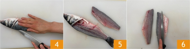 Agora, com uma faca afiada, corte ao longo do dorso do robalo 4; assim você obterá o primeiro filé 5. Desfilete também a outra parte e elimine as partes mais gordurosas 6, mantendo a pele.