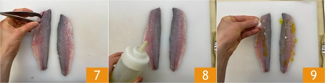 Com uma pinça de cozinha verifique se retirou todas as espinhas do filé 7. Tempere com azeite extravirgem 8 e com uma pitada de sal 9. De 4 robalos você obterá 2 filés por porção.