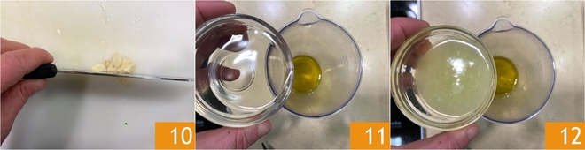 Descasque e pique também o dente de alho 10. Em um copo medidor, coloque o azeite de oliva extravirgem, o vinagre de vinho branco 11 e o suco de limão 12.