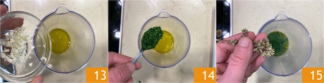 Adicione o alho picado 13, a salsa finamente picada 14 e o orégano seco 15.