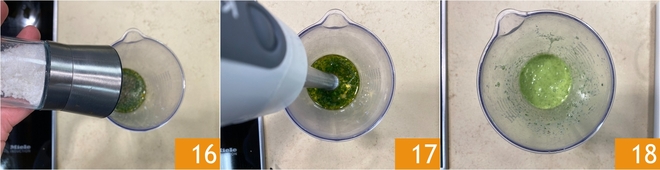 Adicione o sal 16 e misture tudo com um mixer de imersão 17 até obter um molho verde cremoso e homogêneo 18.
