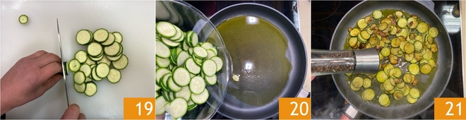 Passe agora para as abobrinhas: corte-as em rodelas finas 19 e aqueça uma frigideira com óleo e um dente de alho. Quando o alho estiver dourado, adicione as abobrinhas 20 e salteie em fogo alto por 5-7 minutos, para que fiquem bem douradas. Tempere com sal e pimenta moída na hora 21.