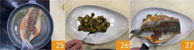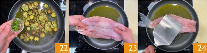 Deixe cozinhar até obter uma crocância dourada, depois vire o robalo, apague o fogo e deixe cozinhar por mais 5 minutos 25, garantindo uma cocção delicada. Monte o prato: disponha as abobrinhas salteadas no fundo do prato 26 e coloque o robalo bem dourado por cima 27.