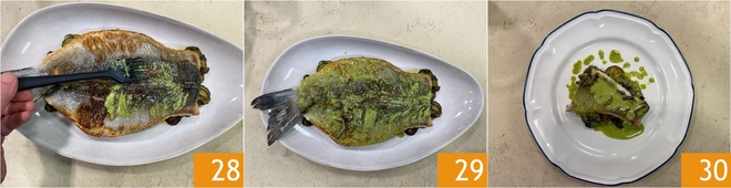 Pincele generosamente a superfície do peixe com o molho 28, cobrindo-o de forma uniforme 29 e decore com folhinhas de tomilho. O robalo na frigideira com abobrinha salteada está pronto para ser servido 30.