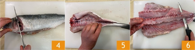 Corte a cabeça 4 e abra o peixe como um livro 5, deslizando a faca ao longo da espinha central, então remova delicadamente a espinha dorsal e as espinhas principais 6.