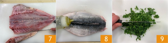 Corte o filé removendo a parte mais fina e gordurosa da barriga 7 para obter uma superfície homogênea. Neste ponto, tempere o robalo aberto com um fio de óleo 9 e sal. Reserve enquanto prepara o molho. Pique a salsa 9.