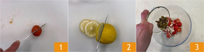 Para preparar o Robalo no papelote, lave e corte os tomatinhos ao meio 1. Fatie o limão 2. Em uma tigela, coloque os tomatinhos, os pinoli e as azeitonas 3.