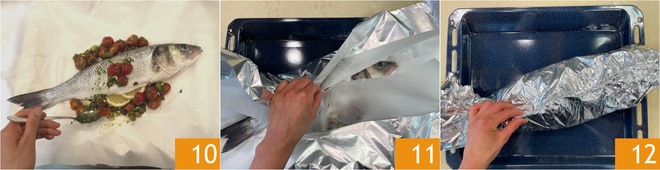 Em uma superfície, coloque uma folha de papel alumínio e sobre ela uma folha de papel manteiga. Coloque o robalo e distribua os tomatinhos ao redor 10. Feche as duas folhas uma 11 sobre a outra 12, certificando-se de selar bem as bordas. Cozinhe em forno estático pré-aquecido a 170 graus por 30/35 minutos.