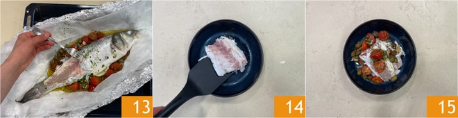 Uma vez cozido, retire o papelote do forno, abra-o e limpe o peixe ainda quente. Pegue uma borda da pele com o garfo e levante-a para removê-la 13. Sirva os filés de robalo no papelote ainda quentes 14 junto com o molho à base de tomatinhos, pinoli e azeitonas 15.
