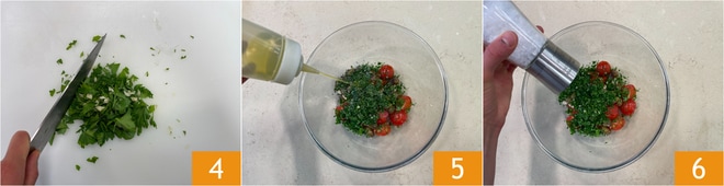 Pique a salsinha e o alho previamente sem casca 4 e adicione aos tomatinhos. Tempere com azeite 5, sal 6 e pimenta.